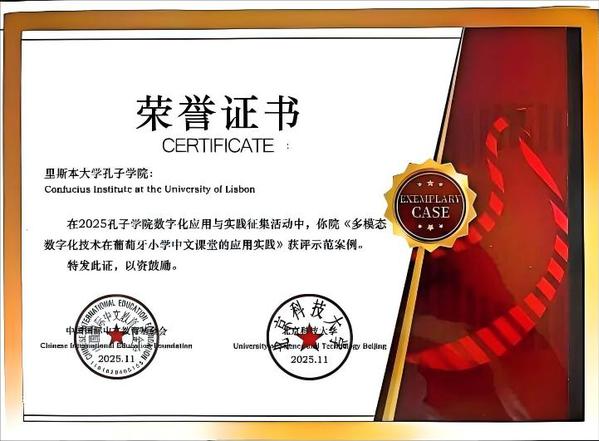 里斯本大学孔子学院申报的《多多模态数字化技术在葡萄牙小学中文课堂的应用实践》案例,从全球83 项参评案例中脱颖而出,获评 “示范案例奖”。该活动由中国国际中文教育基金会与北京科技大学联合主办,最终共 20 项案例入选 “示范案例”。