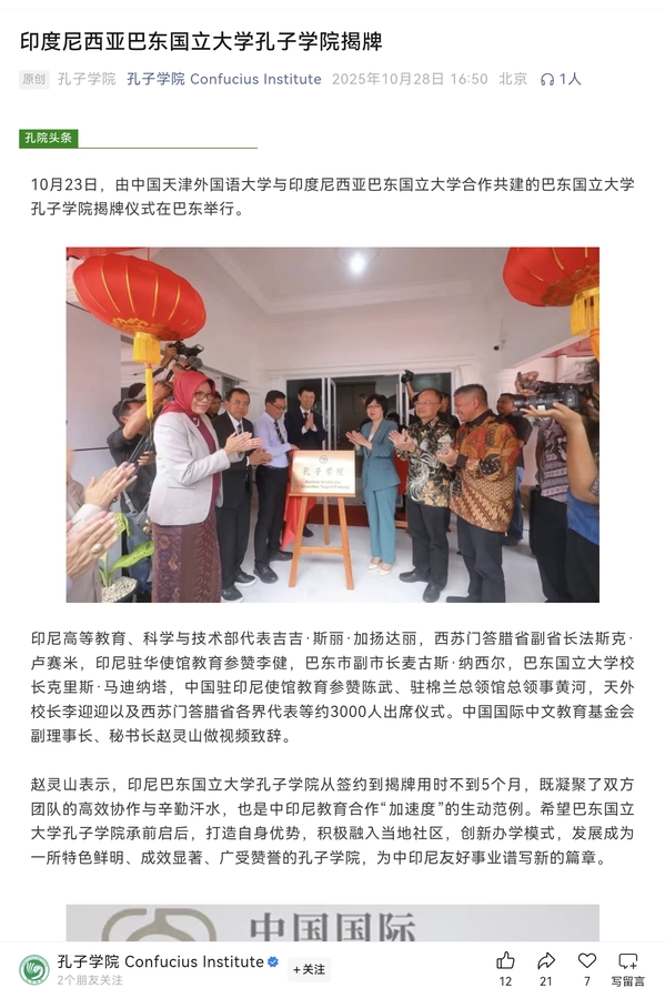 10月23日,由中国天津外国语大学与印度尼西亚巴东国立大学合作共建的巴东国立大学孔子学院揭牌仪式在巴东举行。